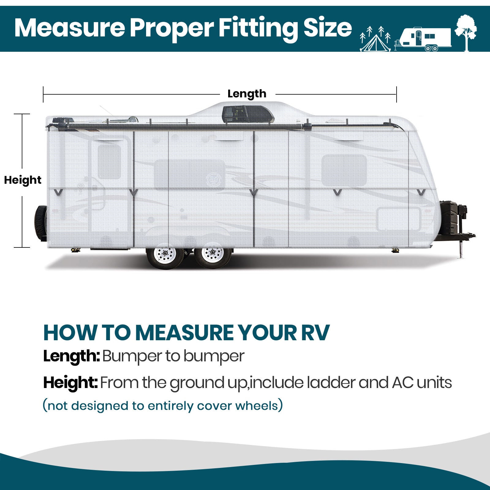 - Include 4* tire cover ,1*adhesive repair patch , 1*tongue jack cover,1*storage bag; 1 *ladder cap,6* gutter cover with sponge design.Please measure before purchasing, measure from bumper to bumper, including the bumpers and ladder. Do not use the RV model number or manufacturer-stated length as the actual length may vary.