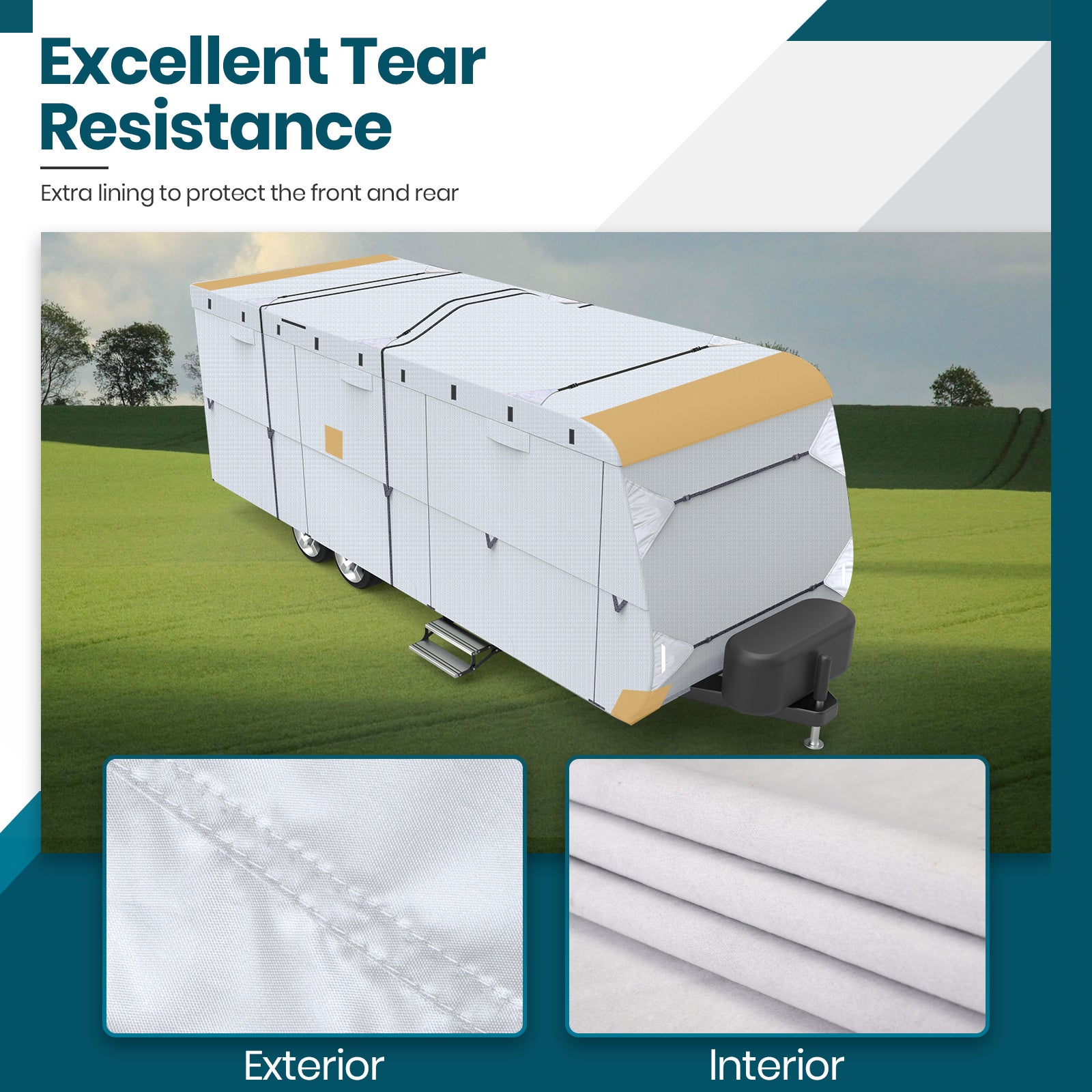- Upgraded Fabric: Our travel trailer cover is made of high-strength and high-density 210D polyester (which is much more waterproof than non-woven fabric) with silver coating(provide a more stylish look), corner reinforcements at rear + all double stitch seams, protect your RV from scratch, dust, rain, snow, and UV rays.